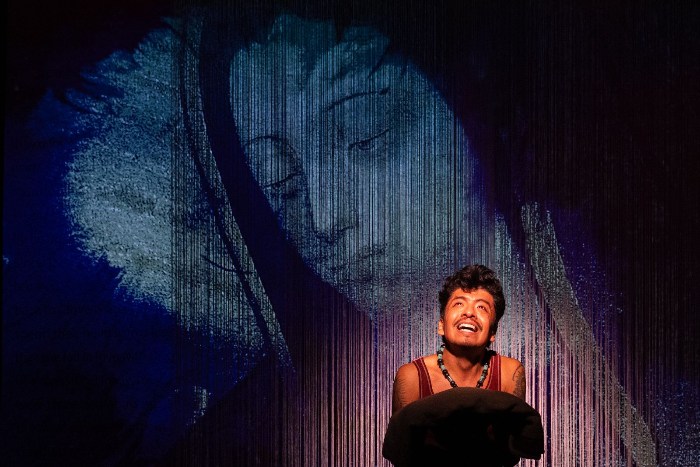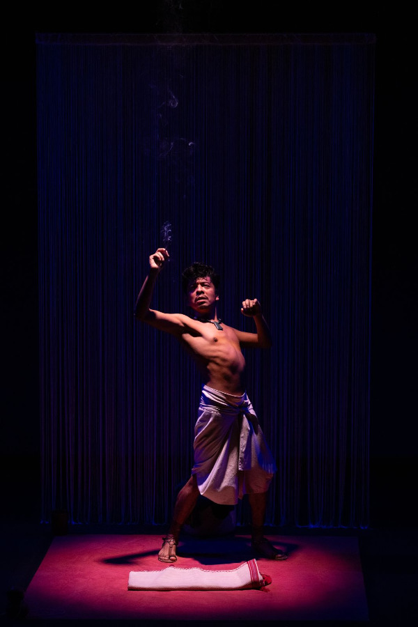 El escenario se presenta desde el inicio con una estética mínima: un tapete al centro, una veladora encendida, la figura de Tonantzin y una cortina de hilos que separa el espacio escénico de una pantalla en la que se proyectan imágenes y videos del culto a la Virgen de Guadalupe. Con dichos elementos, el montaje establece una atmósfera de recogimiento que acompaña el relato personal que sostiene la obra.